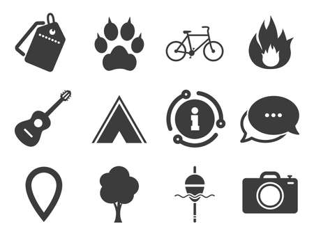 Fishing, fire and bike signs. Discount offer tag, chat, info icon. Tourism, camping icons. Guitar music, photo camera and paw with clutches. Classic style signs set. Vector