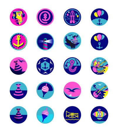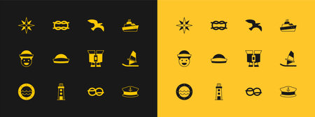 Set Speedboat Lighthouse Binoculars Nautical rope knots Sailor hat Bird seagull Wind rose and icon. Vector.