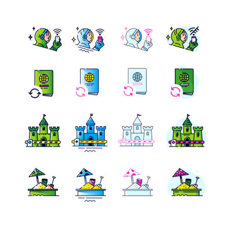Icons on all sorts of topics in different styles. Vector. Astronaut with a phone catches wifi. Passport abroad. Beautiful medieval castle. Sandbox on the playground with toys. Contour style.