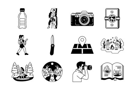 This collection showcases simple travel icons, representing various activities and essentials for exploring the world, all set against a neutral background.