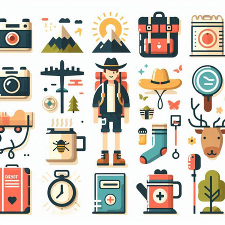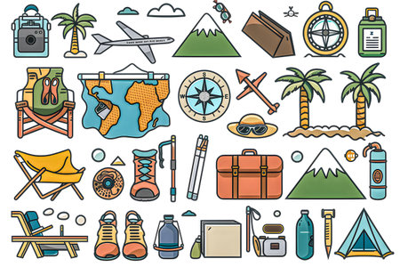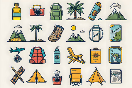 Adventure awaits with this colorful array of travel icons, from mountains to maps. Perfect for wanderlust enthusiasts. Explore the world and dream of new destinations. Generated A.I.