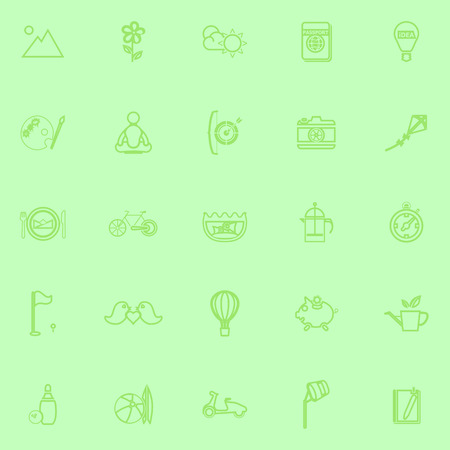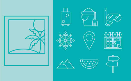 summer vacation travel, tropical beach tourism icons linear style, green background vector illustration