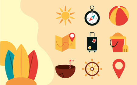 summer vacation travel, tropical beach tourism surfboard compass map suitcase icons flat style vector illustration