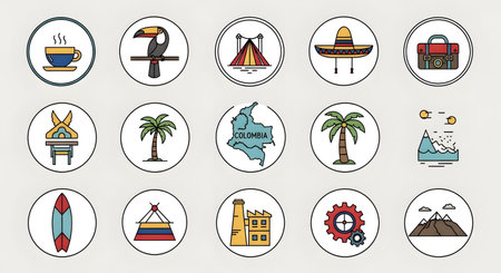 Collection of minimal travel icons illustrating activities like photography, exploring landmarks, and enjoying local foods against a neutral backdrop.