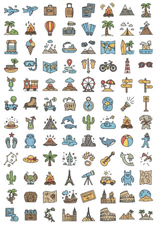 A grid of hand-drawn icons representing various travel and adventure elements, including transportation, destinations, and essential gear.