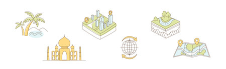 Set of travel-themed web icons, airplane, mountains, palm tree, map, isolated on a white background