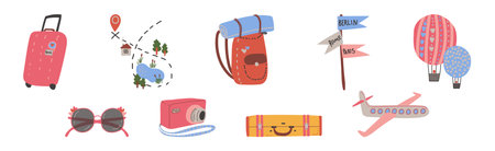 Cute travel collection with luggage, plane, sea, balloon, camera illustration for icon,sticker,printable