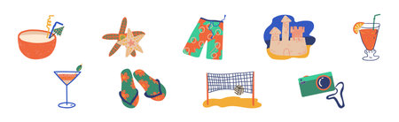 Set of colored icons on the theme of beach holidays, travel, food and drinks. Vector flat illustrations.