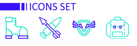 Set line Hiking backpack Deer antlers on shield Crossed bullet with arrow and Hunter boots icon. Vector.