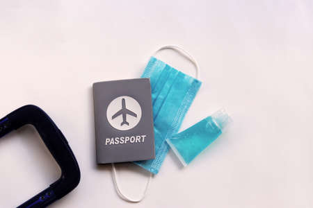 Passport with medical mask, hand sanitizer gel and luggage handle grip on white background with copy space. Lifestyle and traveling concept in New Normal after Covid-19 / Coronavirus pandemic.