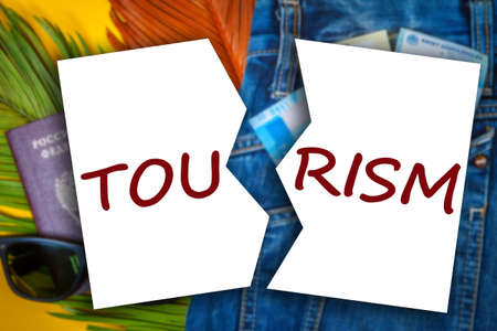 Inscription tourism is torn. Divided inscription symbolizes social distance. Concept - travel ban due to quarantine. Word tourism is divided in half. Concept - distancing to prevent infection