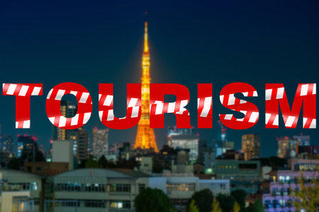 Inscription tourism is tied with a prohibition tape. Concept - ban on traveling around the world. tourism on the background of the night city. Inscription symbolizes the closure of the front.