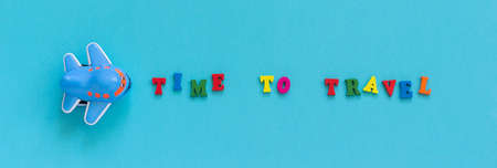 Colorful text Time to travel and children's funny toy plane on blue paper background. Banner Top view Concept tourism, Template for postcard, greeting card.