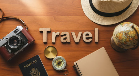 Travel word on wooden background with vintage camera, passport, compass and hat