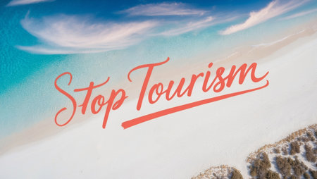 AI Generated. An aerial view captures a beautiful beach featuring the phrase stop tourism written in the sand