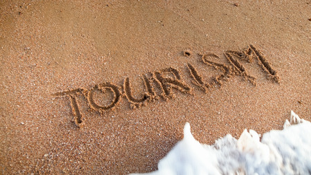 Closeup photo of ocean waves rolling over word toruwism written on wet beach sand. Concept of tourism, traveling, trips and journeys.