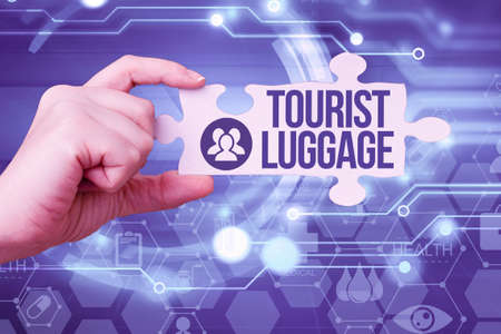 Conceptual display Tourist Luggage. Business showcase big bag that contains everything one needs for traveling Hand Holding Jigsaw Puzzle Piece Unlocking New Futuristic Technologies.
