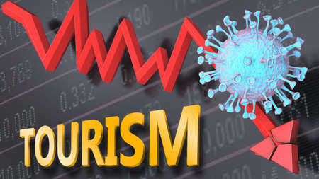Covid virus and tourism, symbolized by a price stock graph falling down, the virus and word tourism to picture that corona outbreak impacts tourism in a negative way, 3d illustration