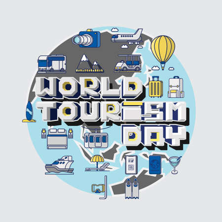 Typography vector illustration of World Tourism Day. 3D Letter composition surounded by icons, and earth globe as background.