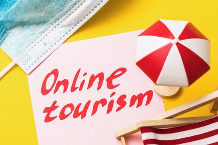 Note with text and beach accessories. Concept on the topic of online tourism in a home quarantine environment
