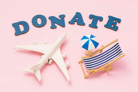 Donate word, toy plane, beach umbrella and deck chair on pink background, concept on vacation donation theme.