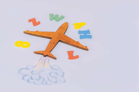 Concept Back to School. Flight of knowledge with airplane and colored letters on the background