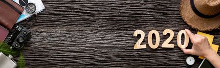 top view hand putting 2020 happy new year number on wood table with adventure accessory item,holiday vacation planning.