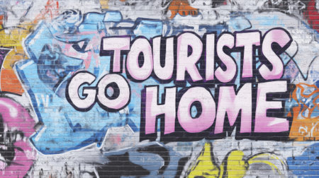 Graffiti message Tourists Go Home on urban wall with vibrant colors, overtourism protest concept background, AI generated