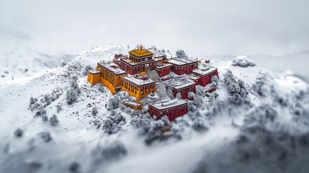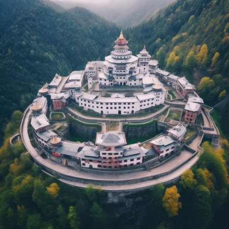 Experience the enchanting view of a mountain monastery enveloped in mist, highlighting stunning architecture amid a serene landscape that inspires peace and tranquility.