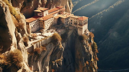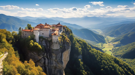 Generative AI : Aerial view of tourists o at The Monastery of Great Meteoron on a natural rock formation in Meteora Trikala Thessaly Greece