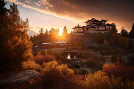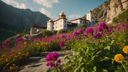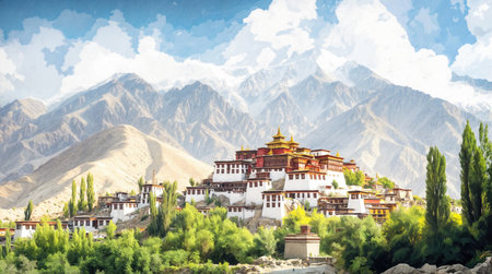 Traditional Tibetan monastery nestled in a valley surrounded by lush greenery and majestic snow capped mountains.
