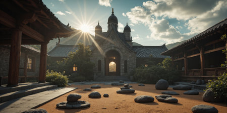 A tranquil monastery atop a hill, surrounded by mist and distant mountains. The peaceful and spiritual setting evokes a sense of calm and solitude.