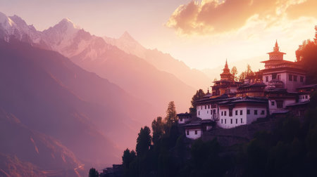 Ancient Buddhist monastery perched on a hillside with majestic Himalayan mountains in the background, bathed in a mystical pink sunset glow.