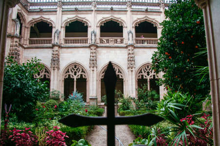 Alcobaca, Portugal - August 2018: View of Alcobaca Monastery from the upper storey of the cloister with natural framing.