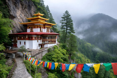 Tranquil scene of a Buddhist monastery nestled on a cliffside in the Himalayas, adorned with colorful prayer flags