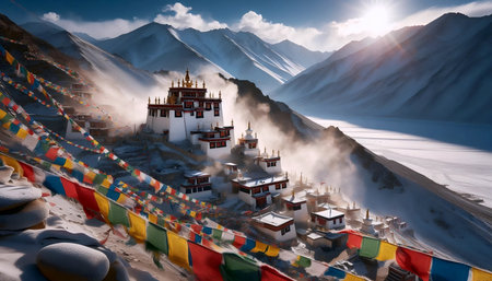 Ladakh monastery with frost crystals on prayer flags, Ai generated image