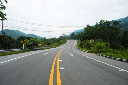 Beautiful foggy road through the forest at daytime, asphalt road on the mountain with foggy in rainy season