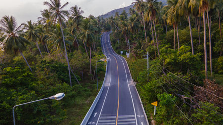 The coastal road passes through coconut plantations and then mountains of Nakhon Si Thammarat Province, Thailand.