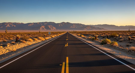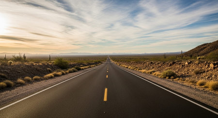 Natural american landscape with asphalt way to horizon. Panoramic picture of a scenic road, USA. Endless straight, Route 66.
