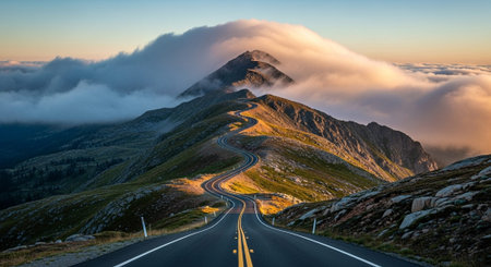The image captures a stunning sunset over an open highway that runs through rolling mountains, with golden light casting shadows and highlights across the landscape, evoking a sense of freedom and adventure on the open road.