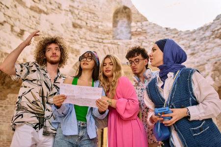 Group of young tourists exploring city streets in summer