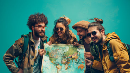Happy friends looking at a map together on a sunny day. Travel, adventure, and friendship concept