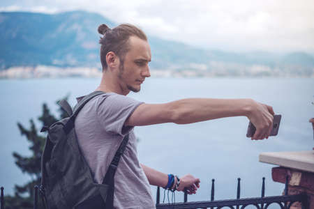 Man traveler with backpack makes a photo on your smartphone outdoors with mountains in the background. The concept of connection and communication in the journey.