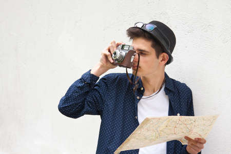 Active Handsome Photographer man Taking Photo on camer while walking, traveling. caucasian Traveler travels alone, using film retro camera. ecotourism, hiking. copy space, portrait