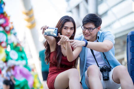 Traveler Asian couple direction and looking on location map while spending holiday trip at Ayutthaya, Thailand, backpacker couple enjoy journey in traditional city. Lifestyle couple travel concept.