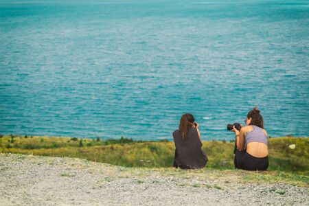 SOUTH ISLAND, NEW ZEALAND - DECEMBER, 2017: Two girls photographing beautiful lake Pukaki with turquoise water