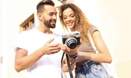 Two handsome tourists with a camera stand and look for a photo walking around the decorated market in the city square