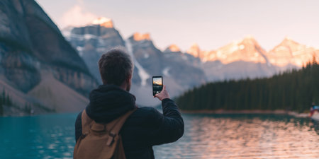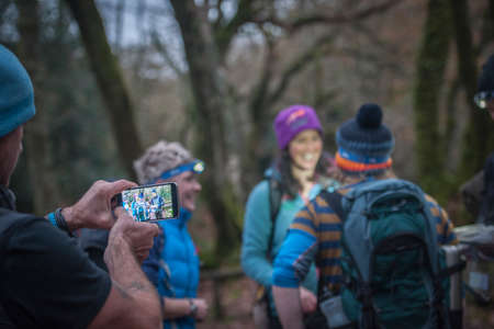 Smiling middle aged hiker taking a photo with his mobile phone.