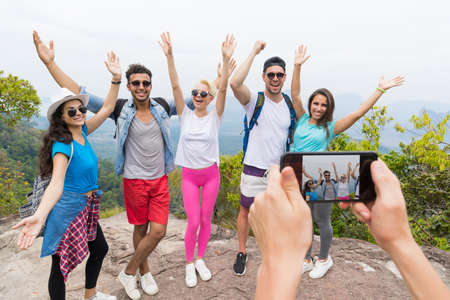 Cell Smart Phone Taking Photo Of Cheerful Tourist Group With Backpack Over Landscape From Mountain Top, People Posing With Raised Hands