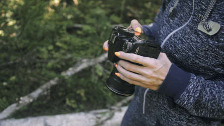 Traveler photographing scenic view in forest. One caucasian woman shooting close up look. Girl take photo video on dslr mirrorless camera.